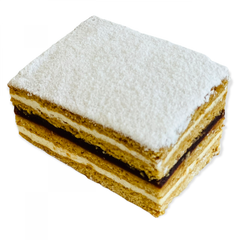 Prajitura clasica cu foi cu miere si crema pe baza de gris cu unt si marmelada de fructe.